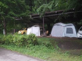 雨天時にも安心な屋根付きサイト・他のテントサイトから離れて、鬼怒川(遊歩道)のすぐ目の前。